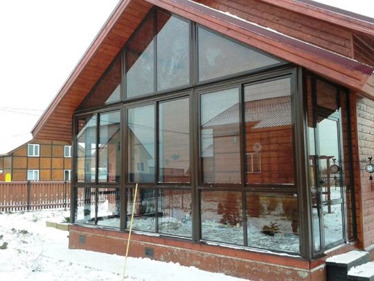 Если на веранде не планируется провести отопление и находиться зимой, можно выбрать алюминиевое или безрамное остекление. Оно защитит помещение от дождя, снега и пыли, но не имеет терморазрыва.