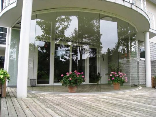 Это самое панорамное остекление веранды из всех перечисленных. Стеклянная стена прозрачна и элегантна, никаких стоек, рам и помех для созерцания окрестностей! Большим плюсом является полная мобильность конструкции: все створки сдвигаются в одну сторону, распахивая проем на 100%. Это ли не идеальное решение для веранды?